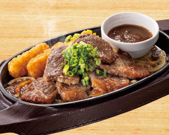 お肉に合うソースとして開発された自家製オニオンソースは、自然な甘味と芳醇な香りで濃厚でありながらさっぱりとした後味に仕上げたお肉の旨みを引き立てる醤油ベースのソースです。ネギをたっぷりと合わせて和風に仕立てたステーキはごはんにも合う味わいです。※カットステーキは下ごしらえで調味液に浸漬してあります。 ※アレルギー情報については、「すかいらーくアレルギー情報サイト」にてご確認ください。