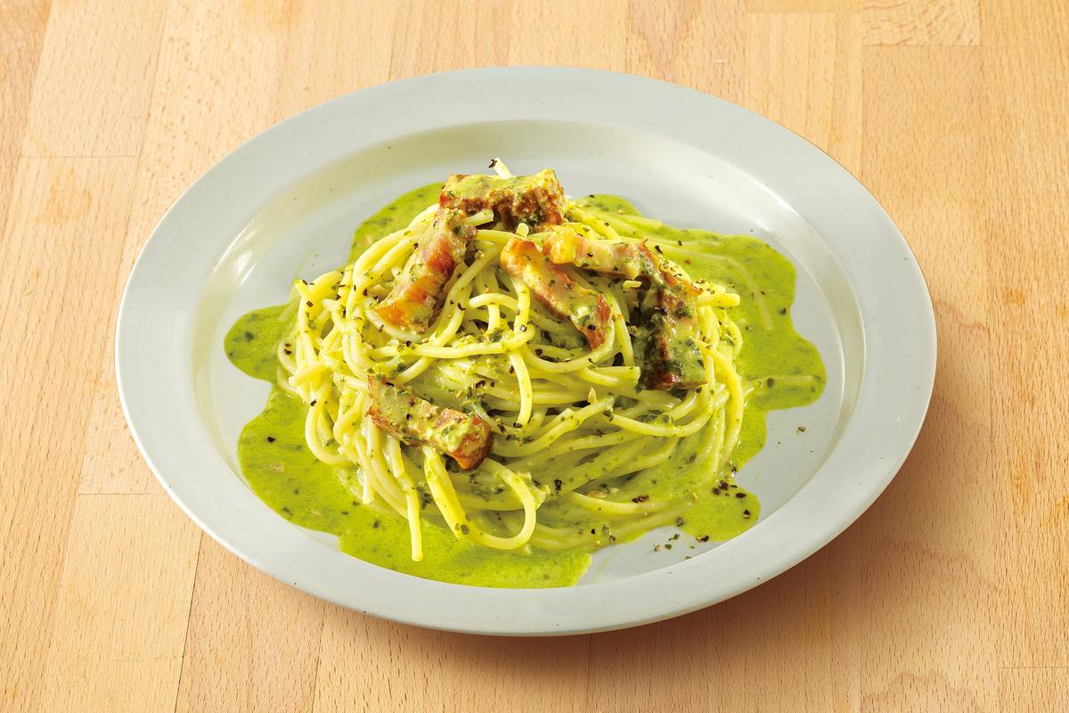 111.グリルベーコンのジェノベーゼクリームパスタ