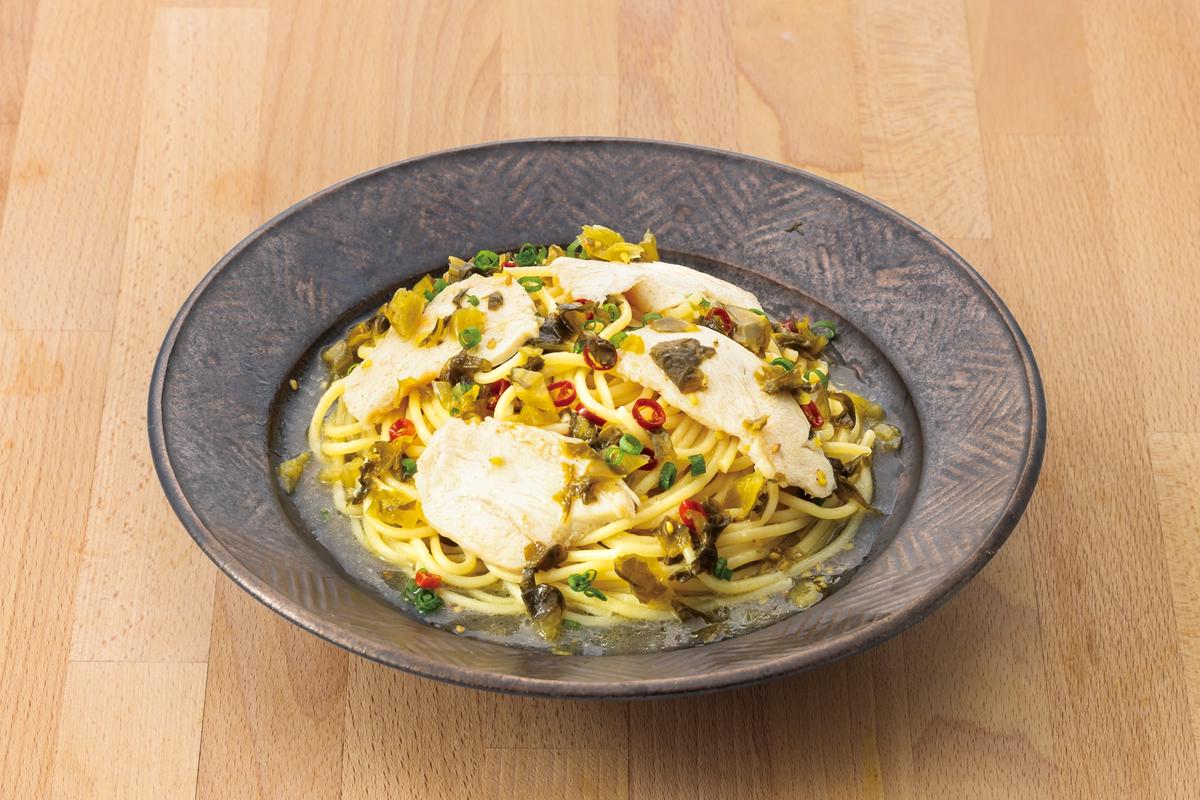 101.桜姫鶏と高菜のピリ辛おだしパスタ