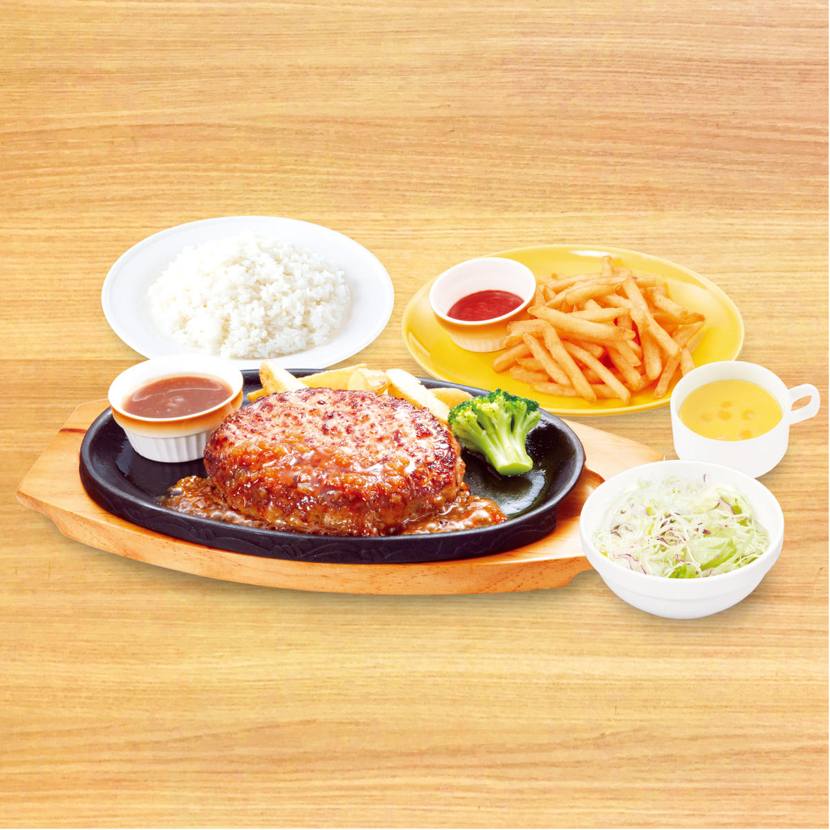 【942】倍盛手ごねハンバーグ弁当 コーンスープ・フライドポテトセット