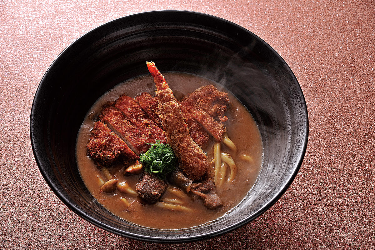 海老フライ、牛すじ、かつ カレー三昧のおうどん