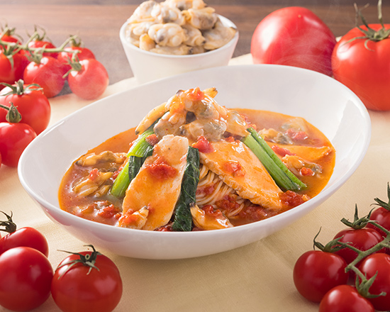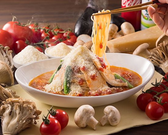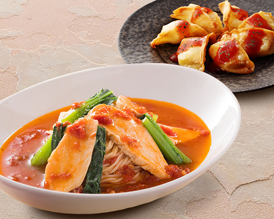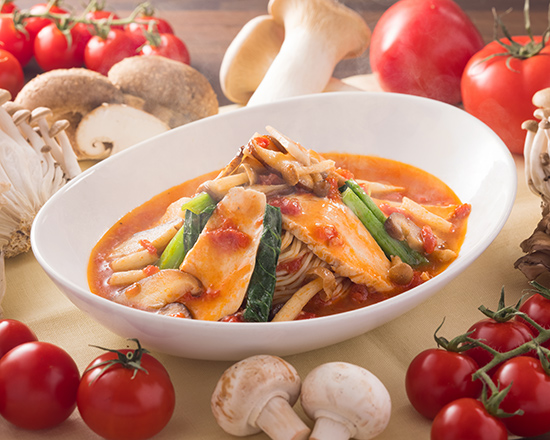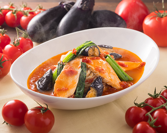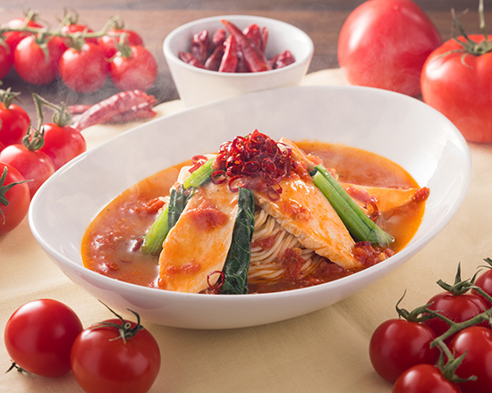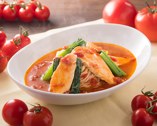 大地の恵みたっぷり!新鮮野菜と低脂肪な鶏ガラをベースにカロリー控えめな《太陽のトマト麺》です