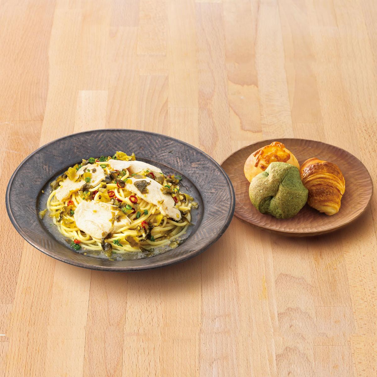 101.桜姫鶏と高菜のピリ辛おだしパスタ<パン3個付き>